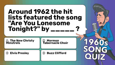 6/10 is what people on average are scoring in this trivia quiz so far. Are you ready to answer questions like "Around 1962 the hit lists featured the song "Are You Lonesome Tonight?" by _____ ?" and "Around 1961 the hit lists featured the song "Cathy's Clown" by _____ ?"