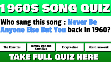 4/10 is what people on average are scoring in this 1960s songs quiz so far. Are you ready to answer questions like "Who sang this song : "Travelin' Man" back in the 1960s?" and "Who sang this song : "Donna" back in the 1960s?"