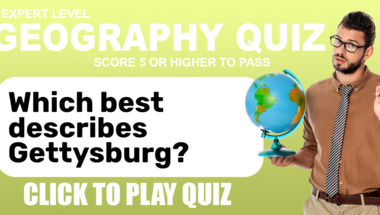 5/10 is what people on average are scoring in this Geography quiz so far. Are you ready to answer questions like "In the film King Kong a giant ape is brought to which city to be exhibited?" and "Which best describes Gettysburg?"